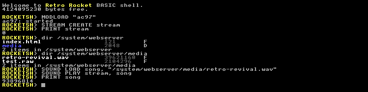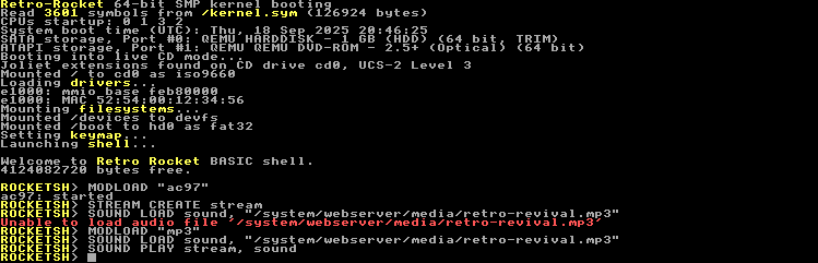 A codec is a small specialised program that knows how to decode audio files into the raw data format used by Retro Rocket. Codecs are provided as kernel modules, just like drivers, and must be loaded before you can use them.