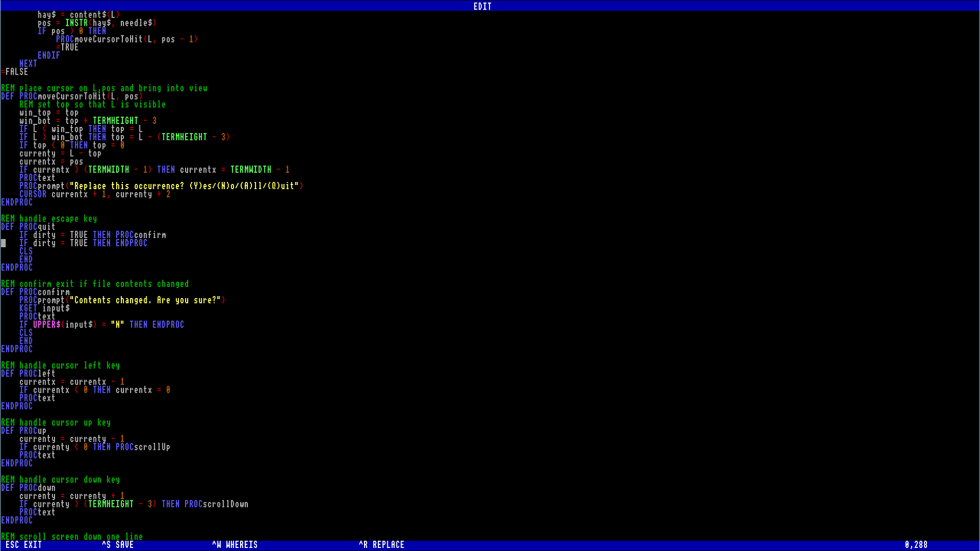 - Ctrl+W starts a search. Type the text to look for, and the editor will highlight the first match.