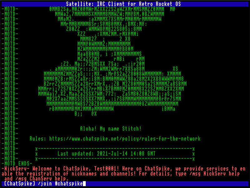The Satellite IRC client. This is a simple IRC client specifically made for Retro Rocket OS. It is still in development, and command line parameters will follow soon.