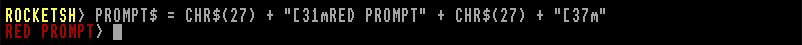 Change PROMPT$ to change the shell prompt from the default of ROCKETSH to the specified value. ANSI escape sequences are supported. You can use CHR$(27) to insert the escape chracter: